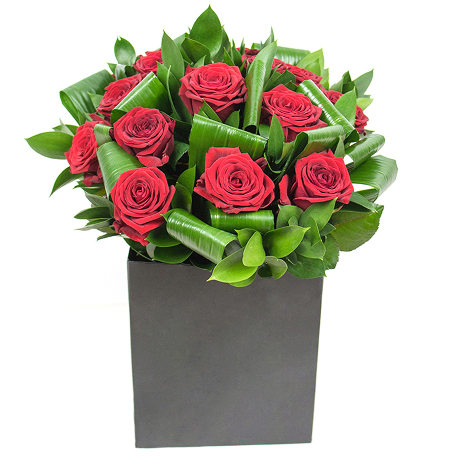 Delight in the beauty of our luxurious red rose arrangement, featuring a harmonious blend of vibrant red roses, graceful aspidistra leaves, and lush ruscus. This bouquet is a perfect statement of style and sophistication for any home.