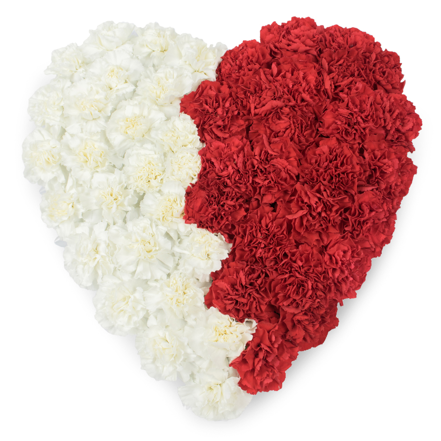 Celebrate love and sympathy with our heart-shaped bouquet, designed with care by Handy Flowers. This exquisite arrangement features a harmonious mix of white and red carnations, perfect for any meaningful occasion.